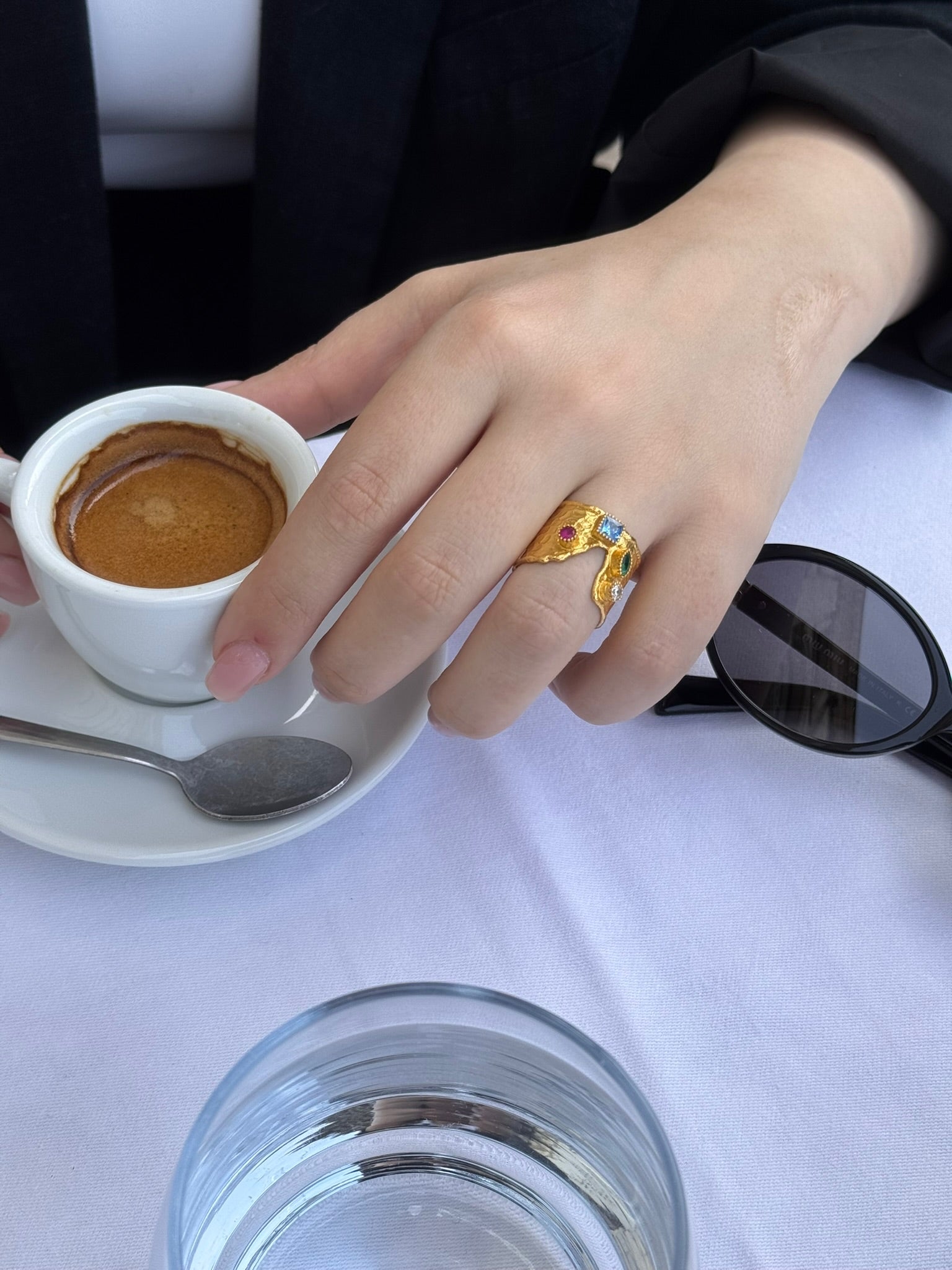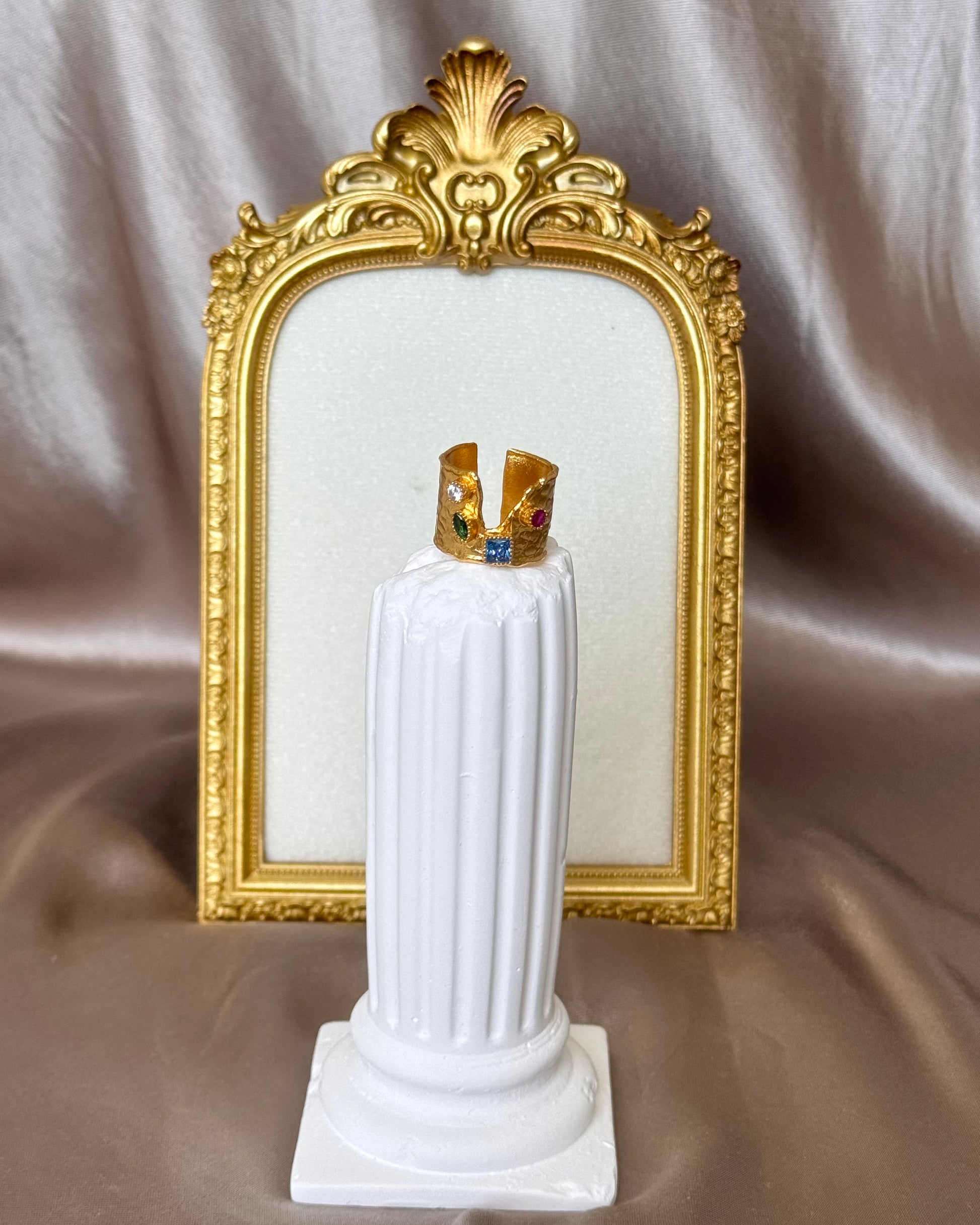 Quatre zircons aux formes, tailles et teintes variées, rose tendre, bleu clair, vert émeraude et blanc lumineux, composent un subtil jeu de couleurs, illuminant ce bijou d’une lumière précieuse. La fissure délicate qui traverse la bague apporte une touche d’authenticité et de caractère, entre force et fragilité.