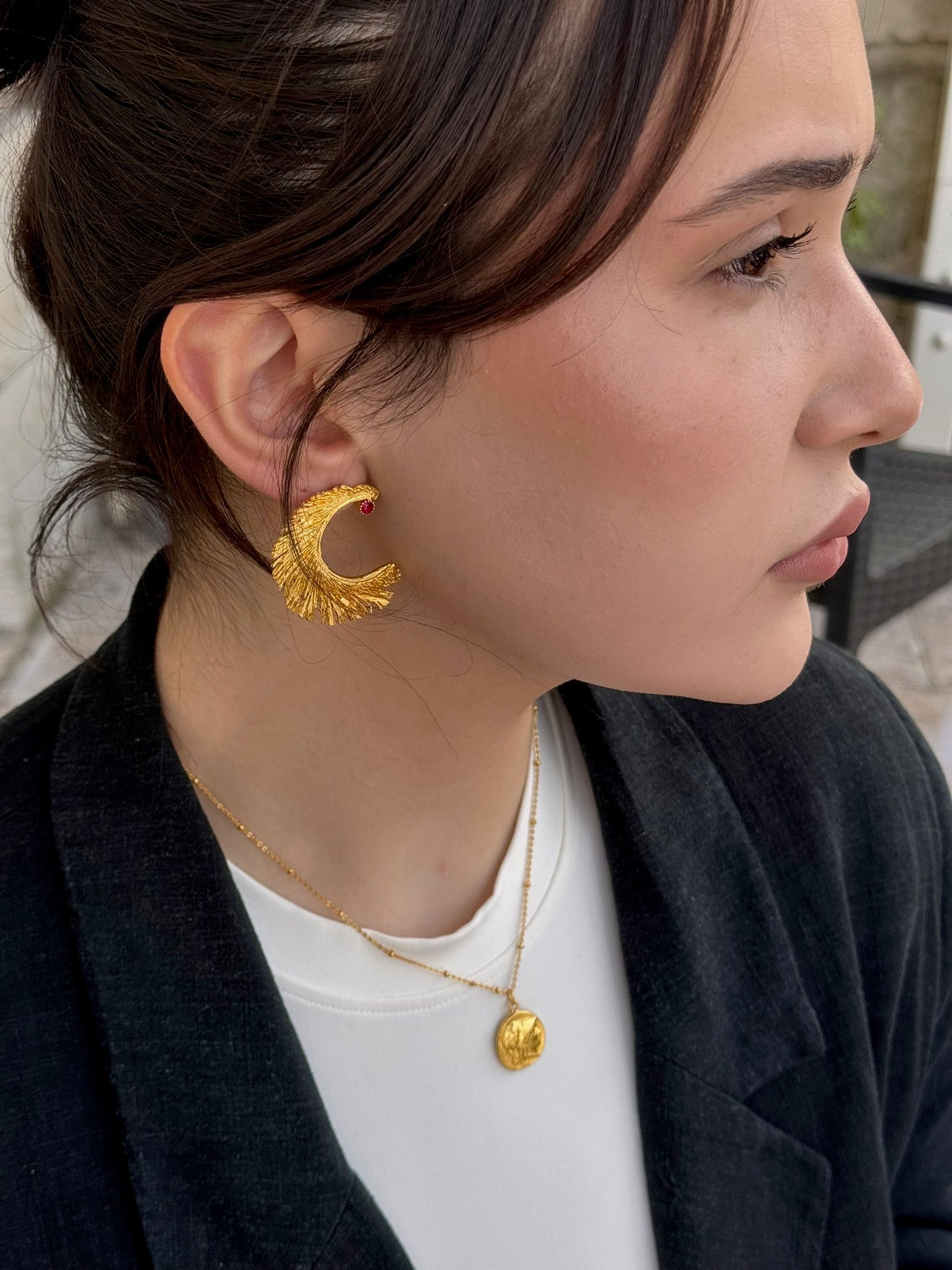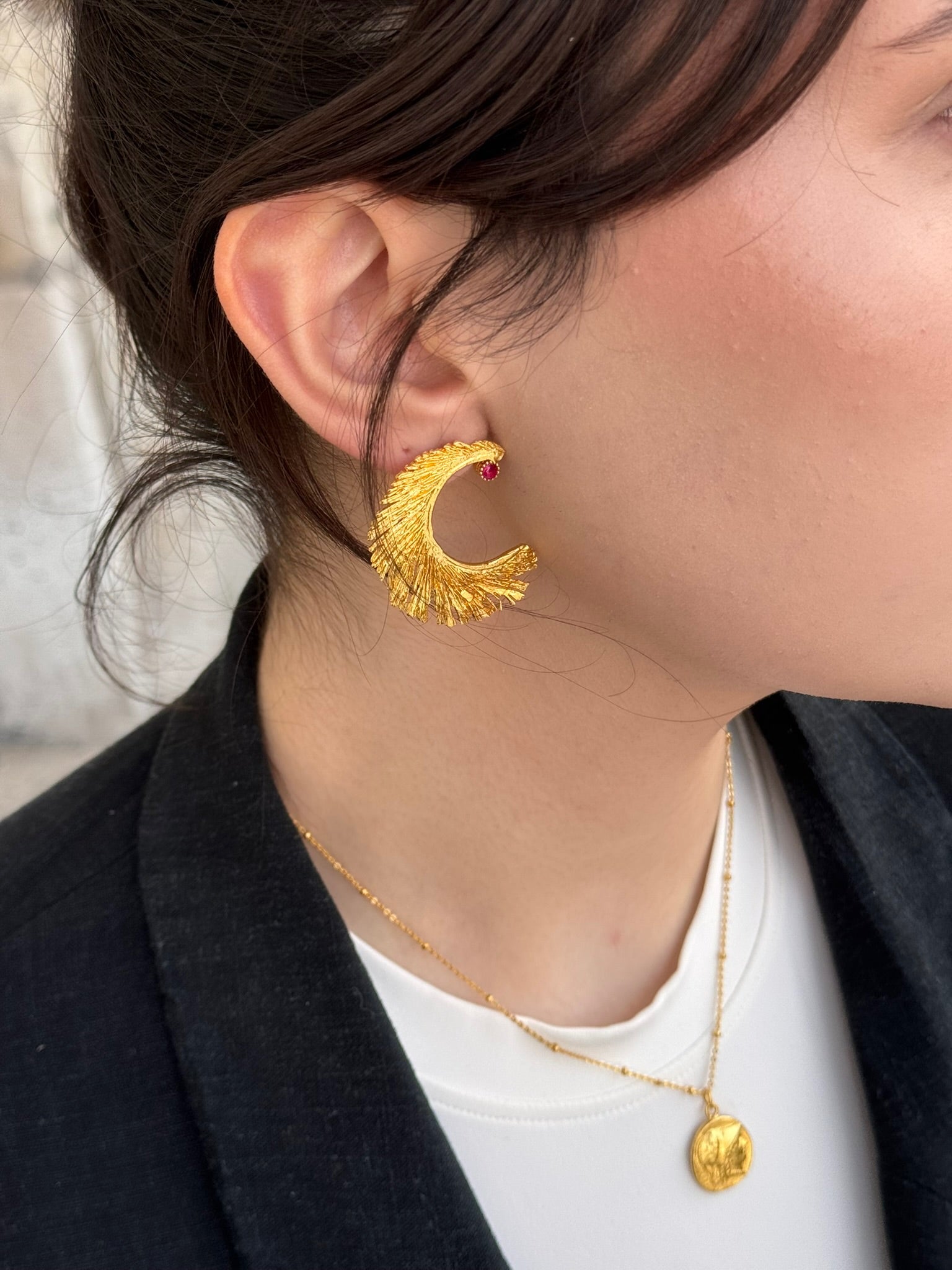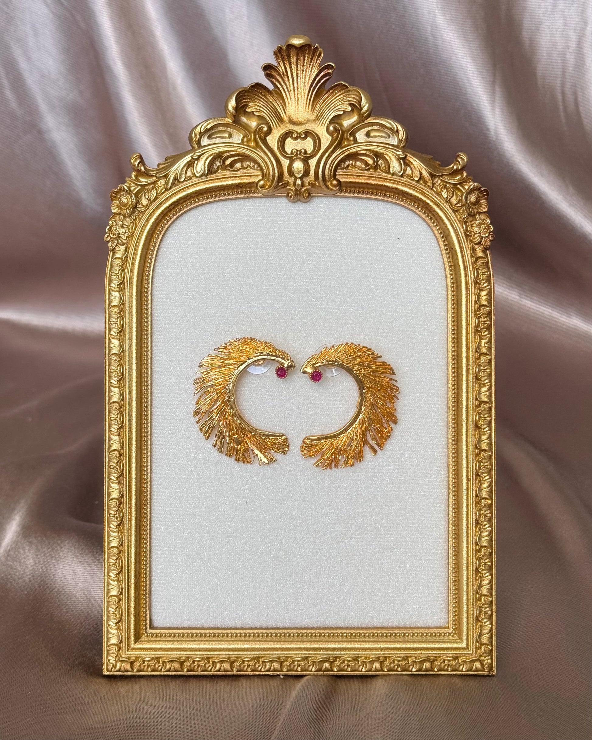 Les boucles Hûma empruntent leur nom à l’oiseau légendaire de la mythologie orientale, porteur de lumière et de destin. Sculptées en forme de plume dorée, elles évoquent la légèreté du ciel et le mouvement du vent.